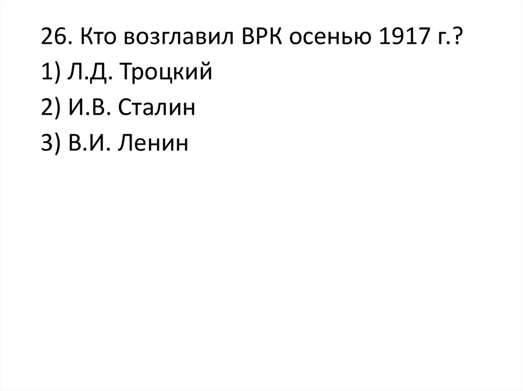 26. Кто возглавил ВРК осенью 1917 г.?1) Л.Д. Троцкий