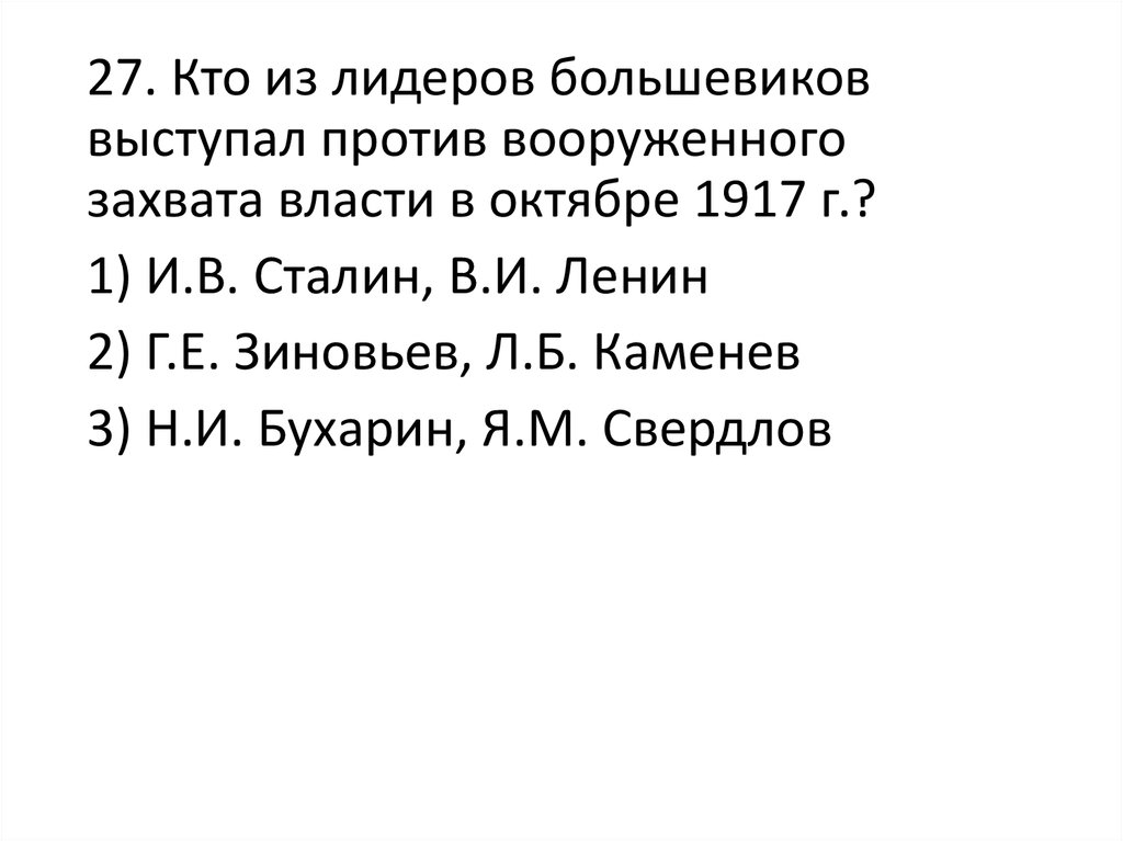 27. Кто из лидеров большевиковвыступал против вооруженного