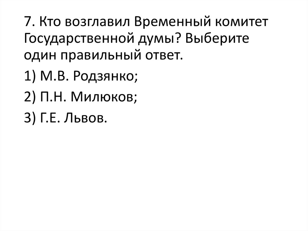 7. Кто возглавил Временный комитетГосударственной думы? Выберите