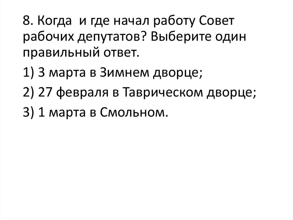 8. Когда и где начал работу Советрабочих депутатов? Выберите один