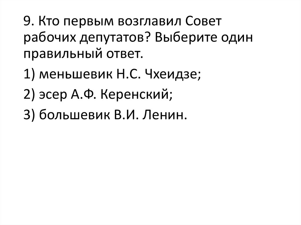 9. Кто первым возглавил Советрабочих депутатов? Выберите один