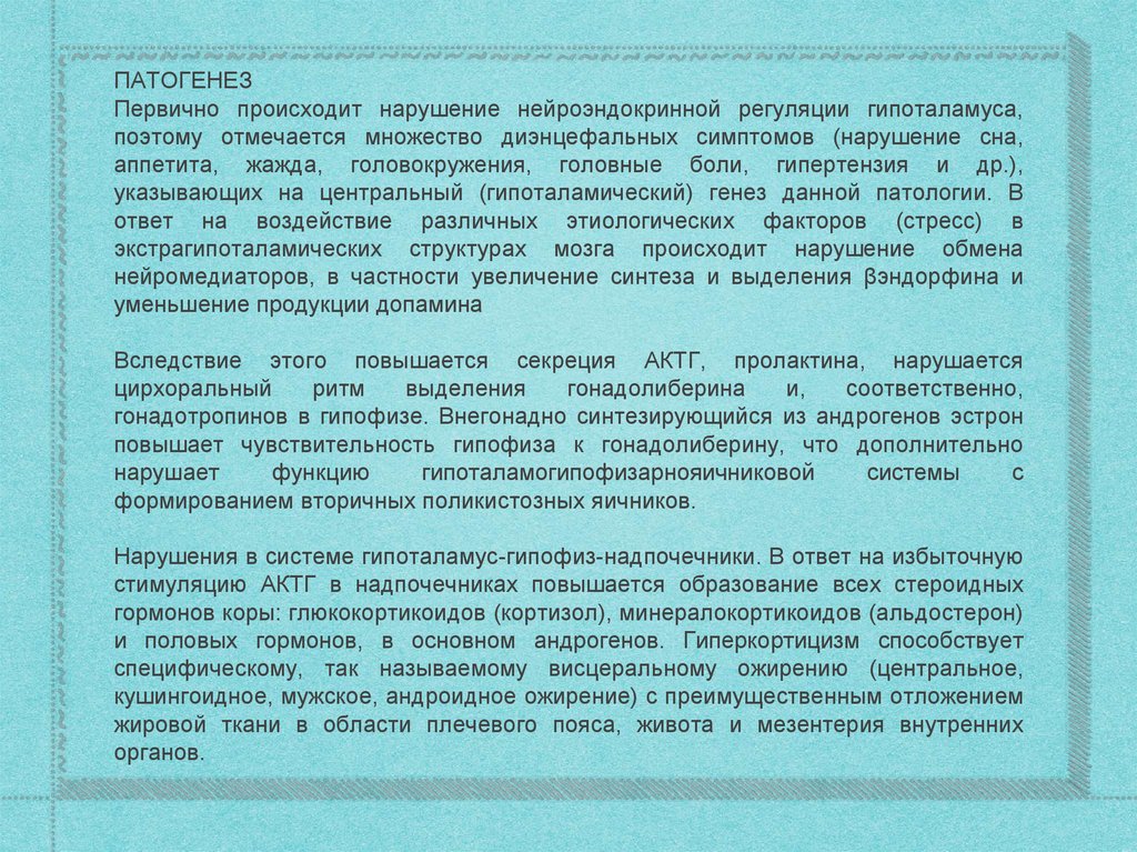 ПАТОГЕНЕЗПервично происходит нарушение нейроэндокринной регуляции гипоталамуса,
