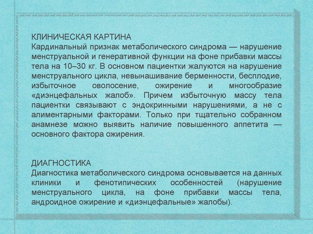 КЛИНИЧЕСКАЯ КАРТИНАКардинальный признак метаболического синдрома — нарушение