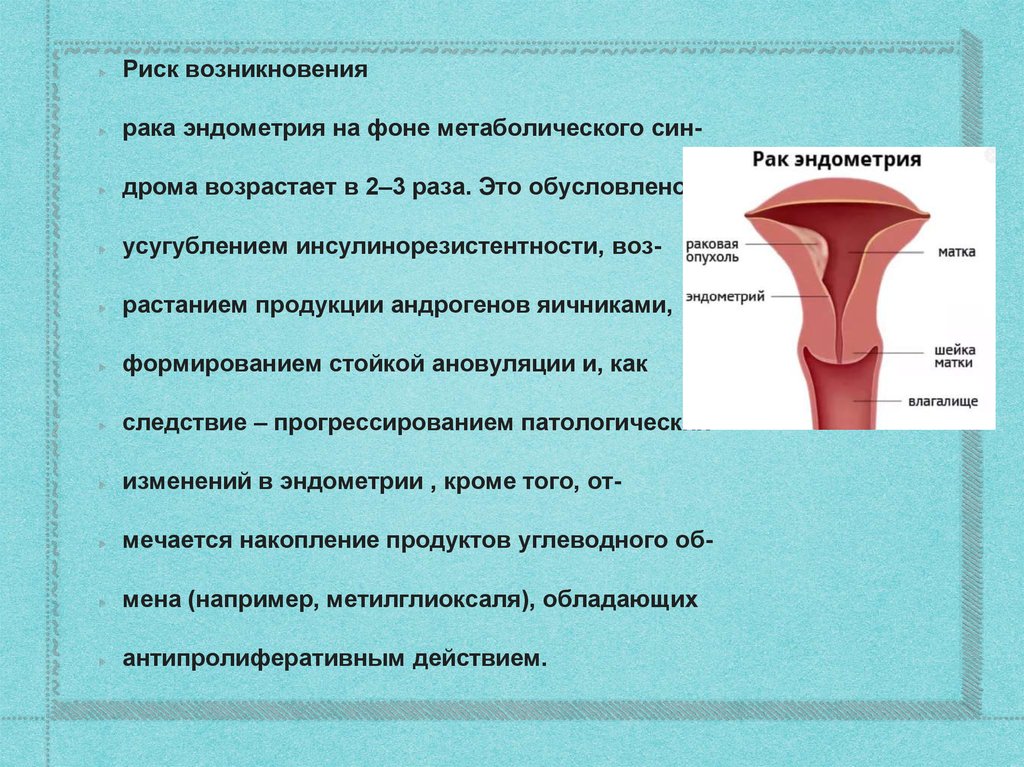 Риск возникновениярака эндометрия на фоне метаболического синдрома возрастает в 2–3 раза. Это обусловлено