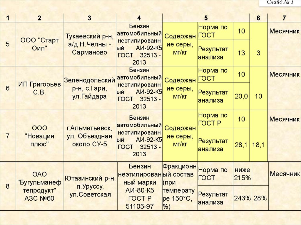 Слайд № 1Перечень объектов, на которых выявлено моторное топливо, не соответствующее