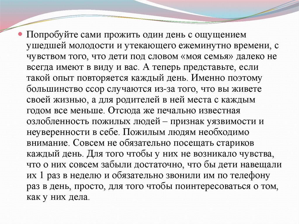 Попробуйте сами прожить один день с ощущениемушедшей молодости и утекающего ежеминутно времени, с