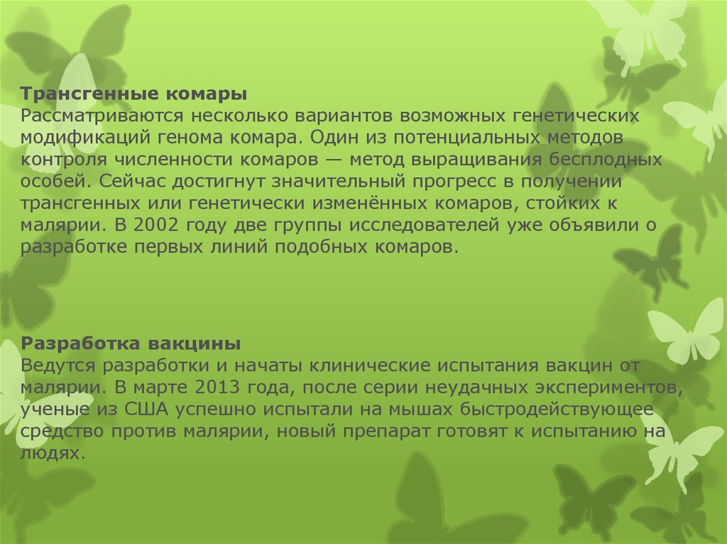 передачу малярии. Сетки — не идеальный барьер, поэтому они