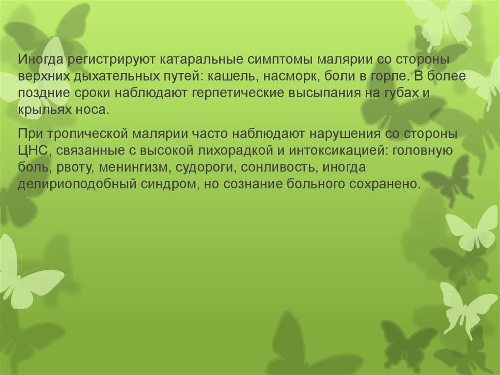 Иногда регистрируют катаральные симптомы малярии со стороныверхних дыхательных путей: кашель, насморк, боли в горле. В более