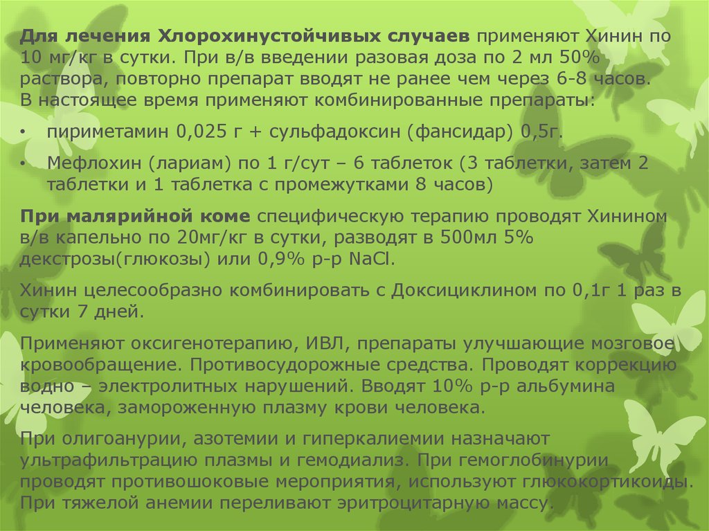 Для лечения Хлорохинустойчивых случаев применяют Хинин по10 мг/кг в сутки. При в/в введении разовая доза по 2 мл 50%