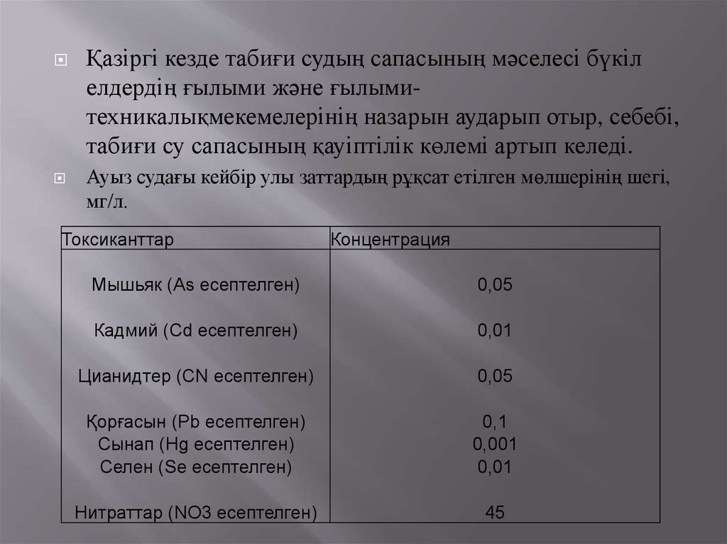 Қазіргі кезде табиғи судың сапасының мәселесі бүкілелдердің ғылыми және ғылымитехникалықмекемелерінің назарын аударып отыр, себебі,