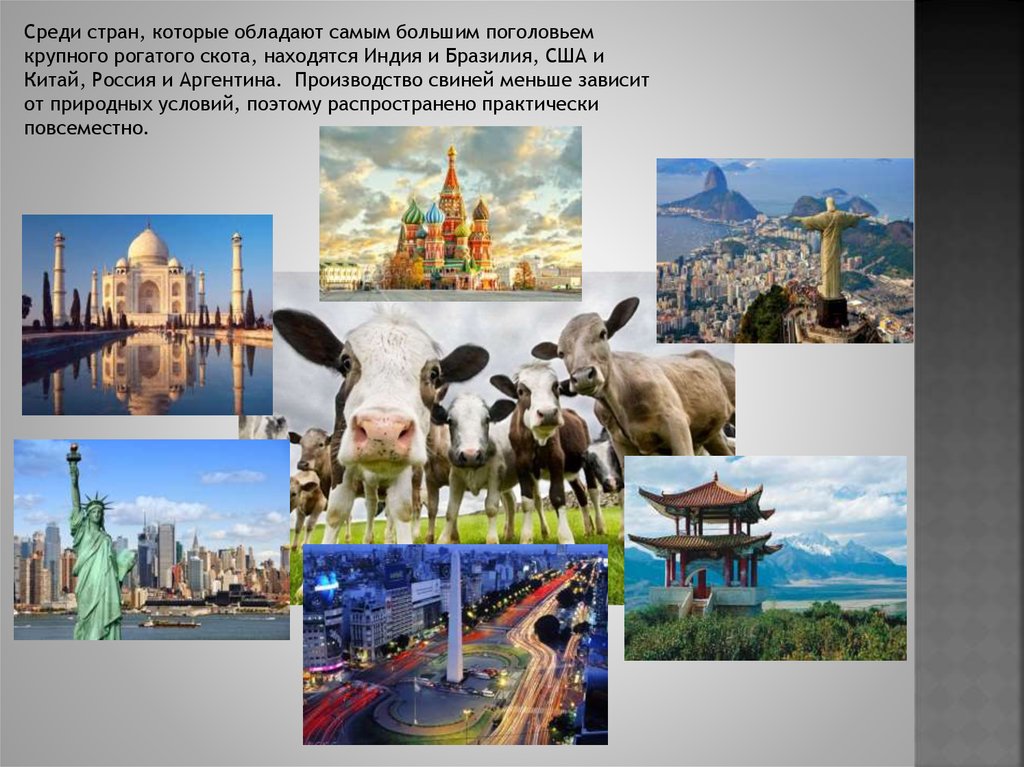 Среди стран, которые обладают самым большим поголовьемкрупного рогатого скота, находятся Индия и Бразилия, США и