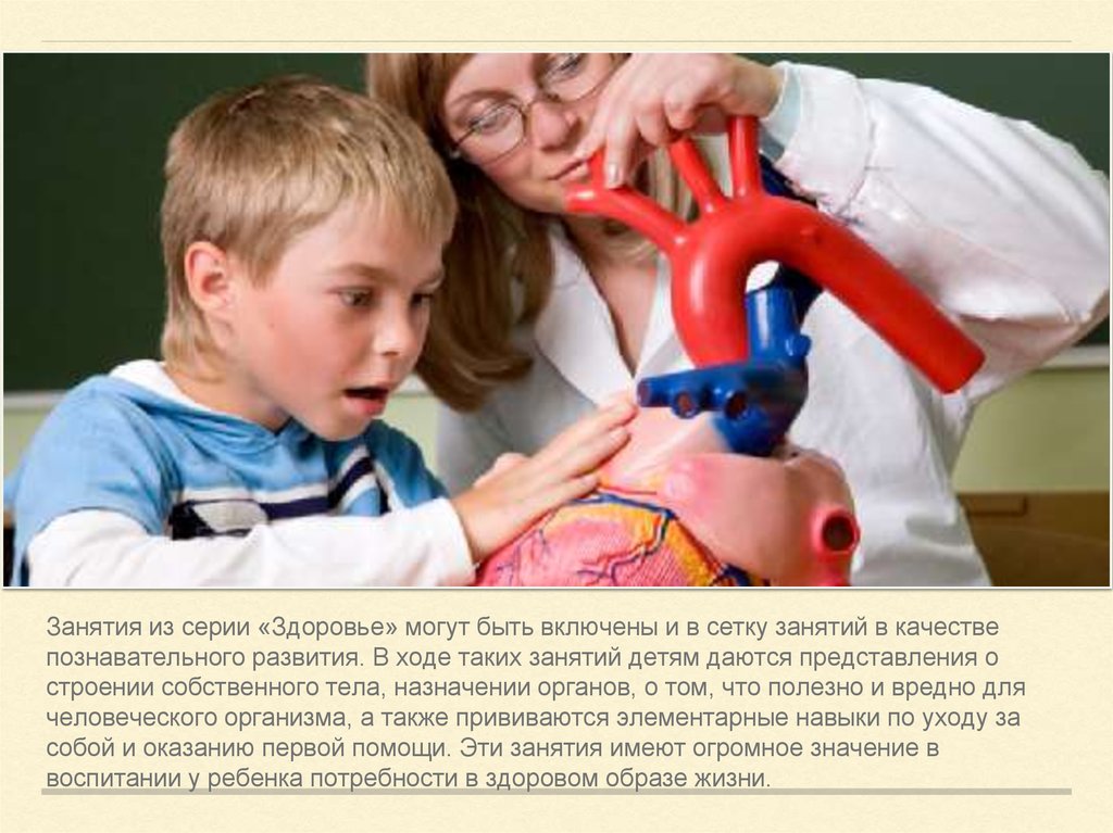 Занятия из серии «Здоровье» могут быть включены и в сетку занятий в качествепознавательного развития. В ходе таких занятий детям даются представления о