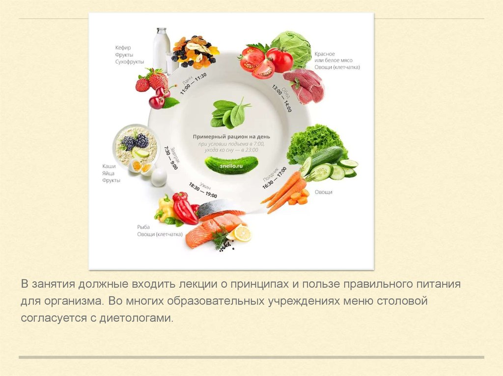 В занятия должные входить лекции о принципах и пользе правильного питаниядля организма. Во многих образовательных учреждениях меню столовой
