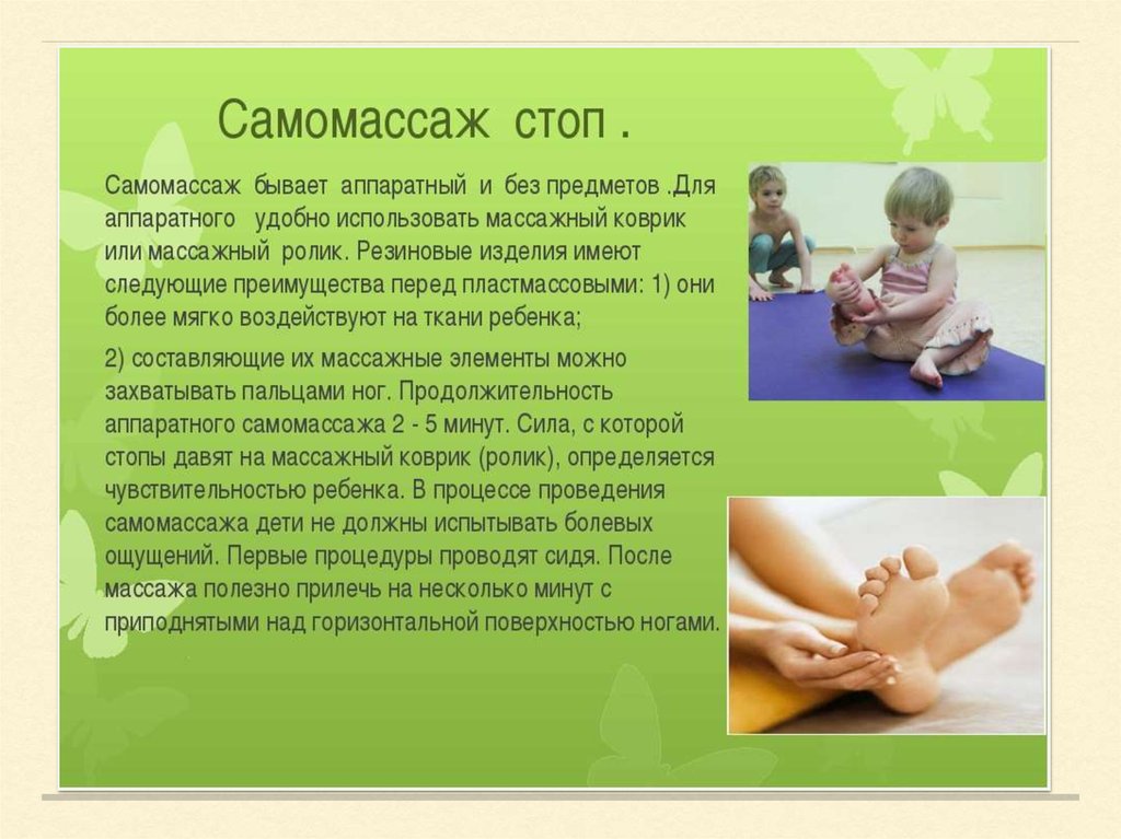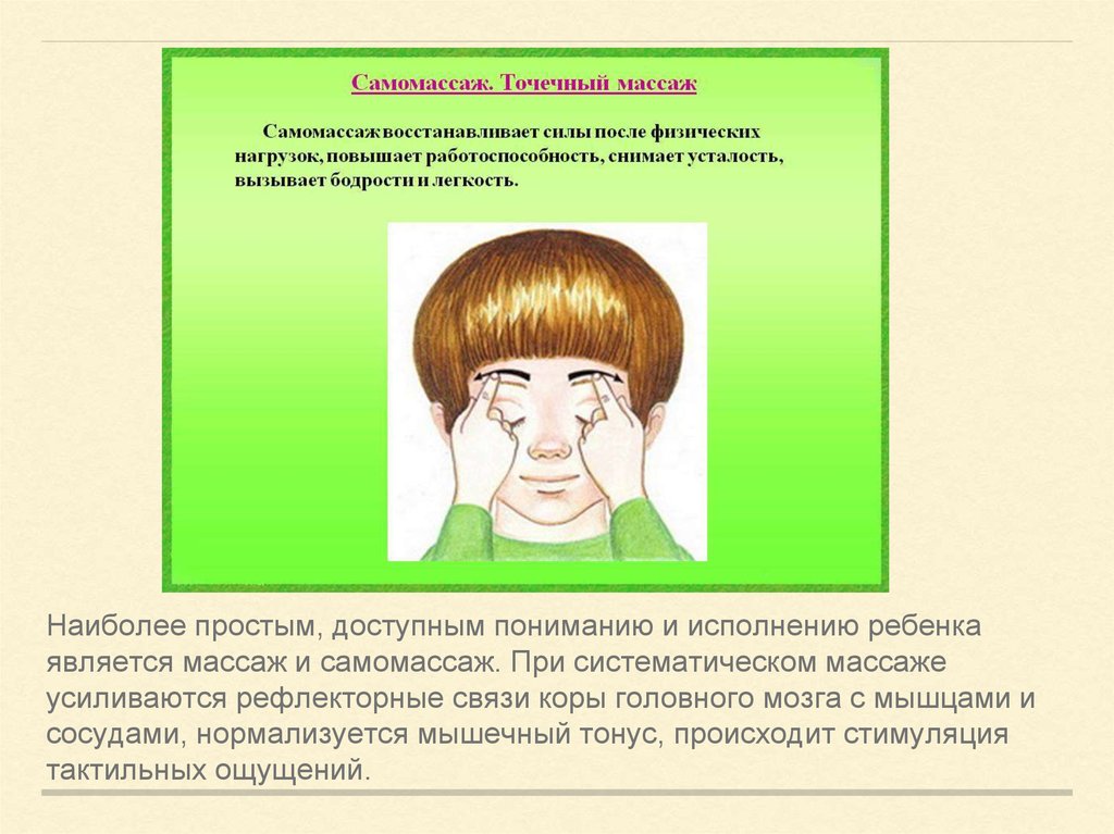 Наиболее простым, доступным пониманию и исполнению ребенкаявляется массаж и самомассаж. При систематическом массаже