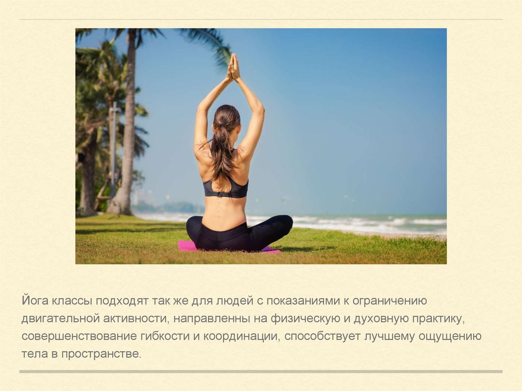 Йога классы подходят так же для людей с показаниями к ограничениюдвигательной активности, направленны на физическую и духовную практику,