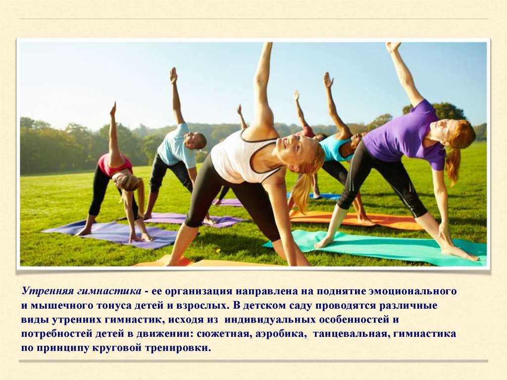 Утренняя гимнастика - ее организация направлена на поднятие эмоциональногои мышечного тонуса детей и взрослых. В детском саду проводятся различные