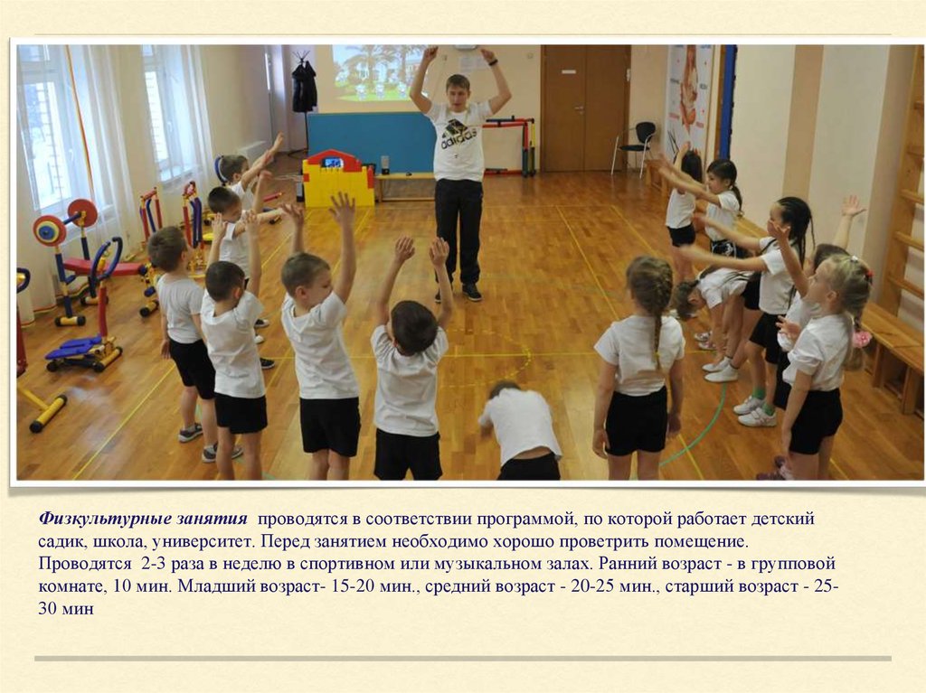Физкультурные занятия проводятся в соответствии программой, по которой работает детскийсадик, школа, университет. Перед занятием необходимо хорошо проветрить помещение.