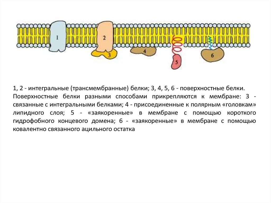 1, 2 - интегральные (трансмембранные) белки; 3, 4, 5, 6 - поверхностные белки.Поверхностные белки разными способами прикрепляются к мембране: 3 связанные с интегральными белками; 4 - присоединенные к полярным «головкам»