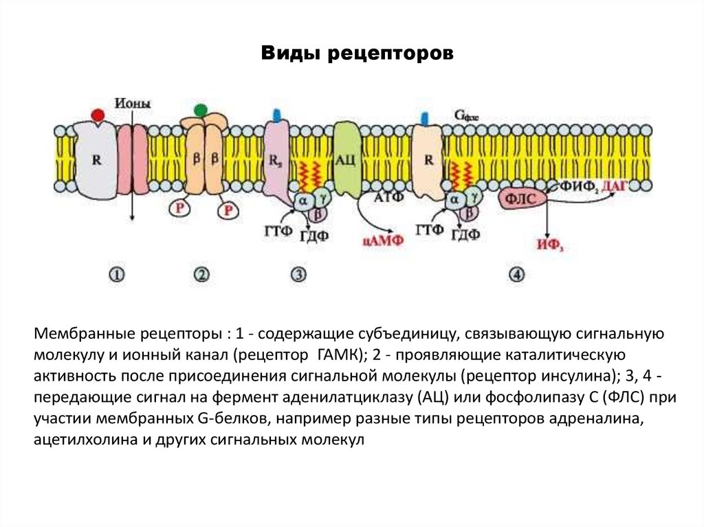Виды рецепторовМембранные рецепторы : 1 - содержащие субъединицу, связывающую сигнальную
