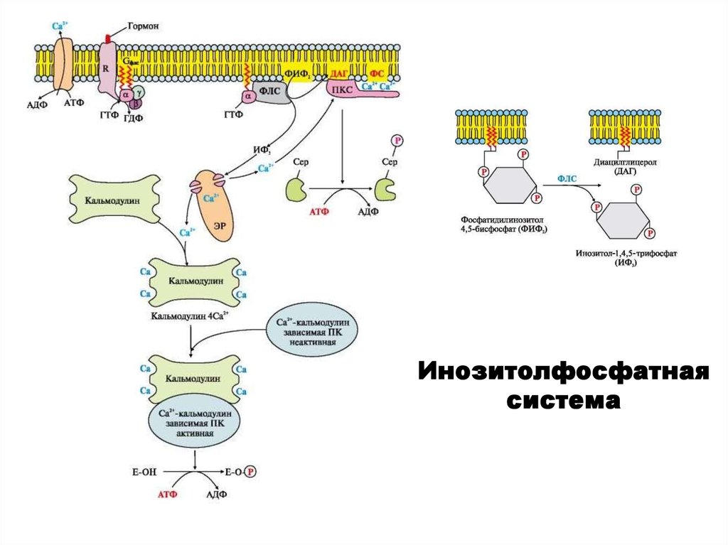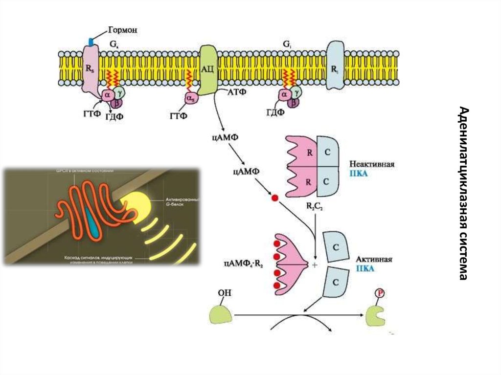 активность после присоединения сигнальной молекулы (рецептор инсулина); 3, 4 передающие сигнал на фермент аденилатциклазу (АЦ) или фосфолипазу С (ФЛС) при