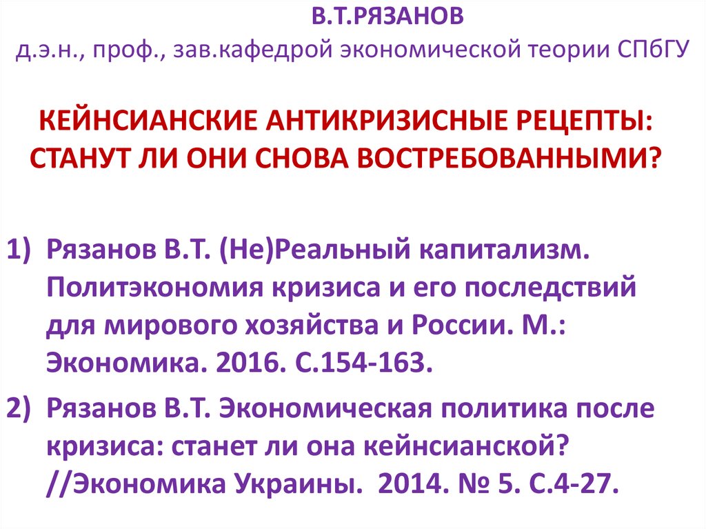 2) Рязанов В.Т. Экономическая политика после