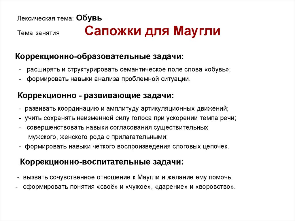 1. Лексическая тема: Обувь Тема занятия Сапожки для Маугли