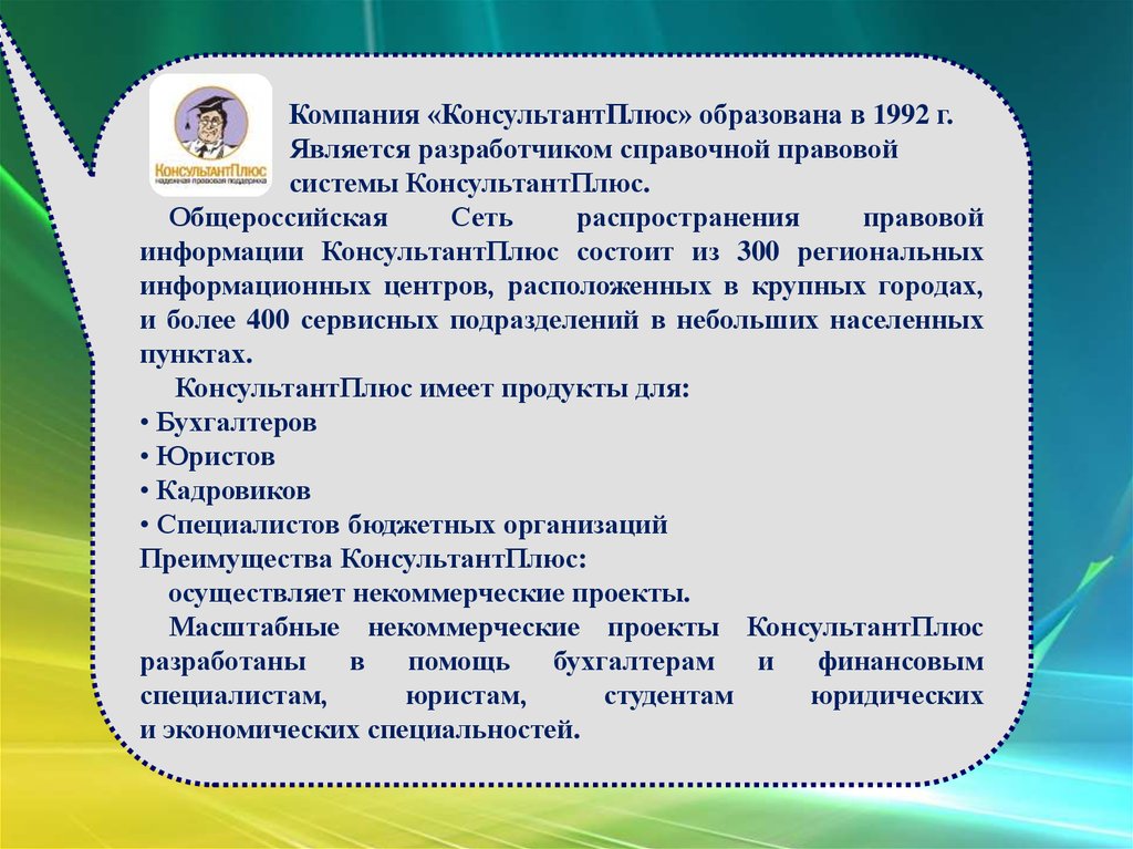 Компания «КонсультантПлюс» образована в 1992 г.Является разработчиком справочной правовой