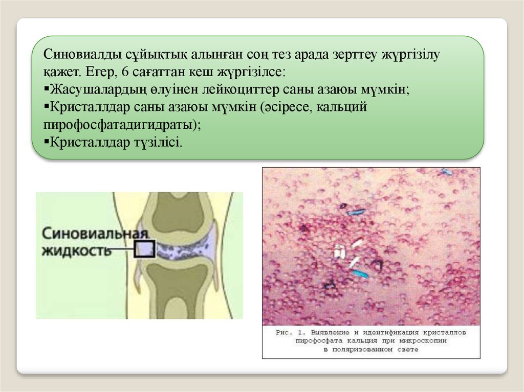 Синовиалды сұйықтық алынған соң тез арада зерттеу жүргізілуқажет. Егер, 6 сағаттан кеш жүргізілсе: