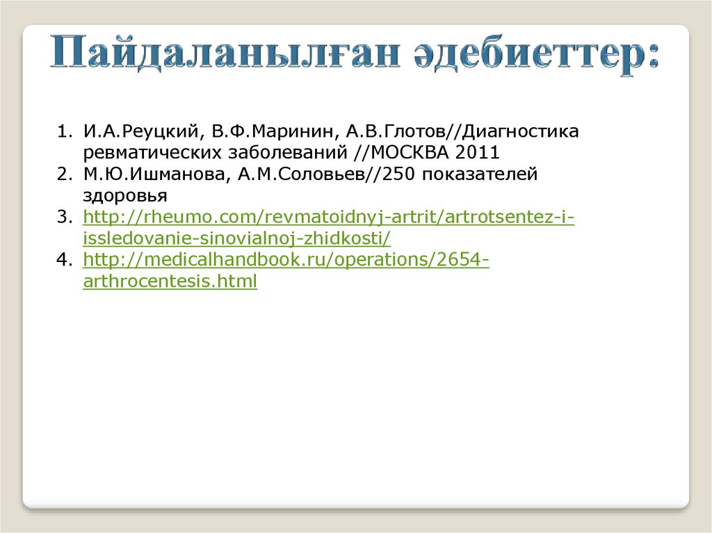 1. И.А.Реуцкий, В.Ф.Маринин, А.В.Глотов//Диагностикаревматических заболеваний //МОСКВА 2011