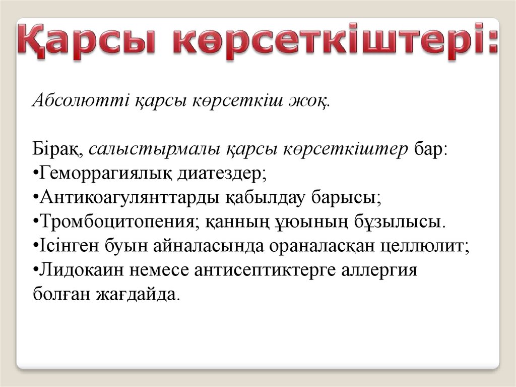 Абсолютті қарсы көрсеткіш жоқ.Бірақ, салыстырмалы қарсы көрсеткіштер бар:
