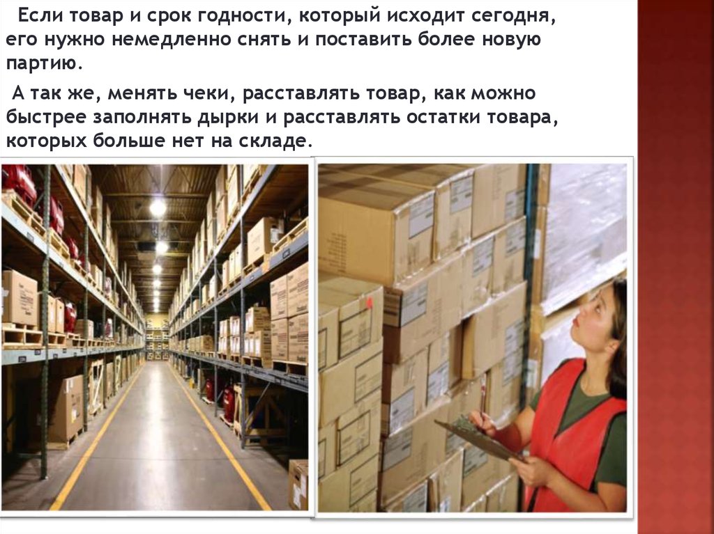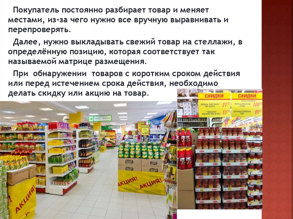 Далее, нужно выкладывать свежий товар на стеллажи, в