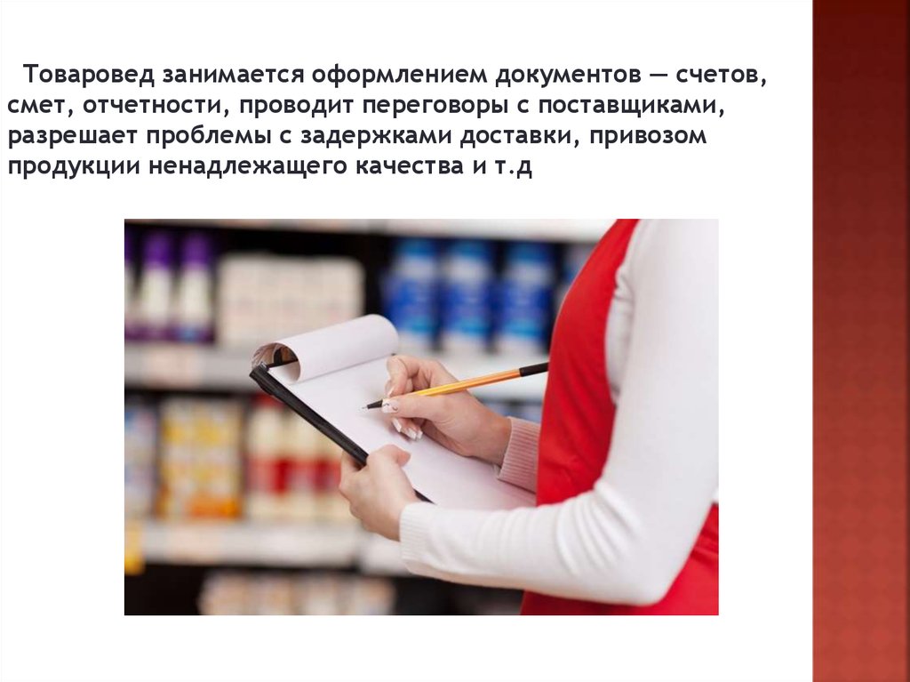 Товаровед занимается оформлением документов — счетов,смет, отчетности, проводит переговоры с поставщиками,