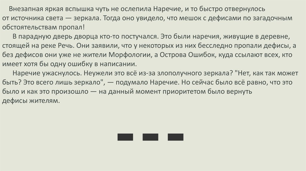 Внезапная яркая вспышка чуть не ослепила Наречие, и то быстро отвернулосьот источника света — зеркала. Тогда оно увидело, что мешок с дефисами по загадочным