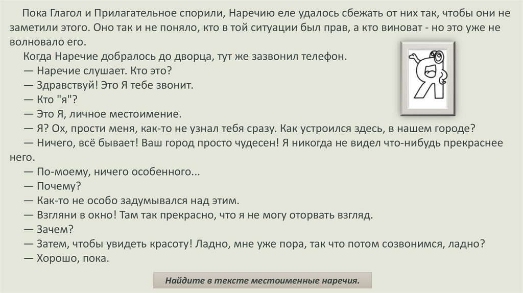 — Здравствуй, Наречие! Как поживаем-с?, — сказал Глагол, при этом облокотившись о стену ближайшего