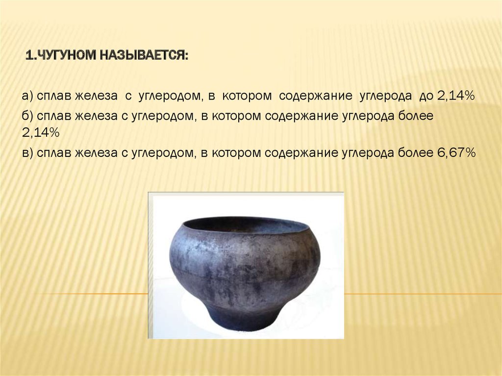 1.ЧУГУНОМ НАЗЫВАЕТСЯ:а) сплав железа с углеродом, в котором содержание углерода до 2,14%