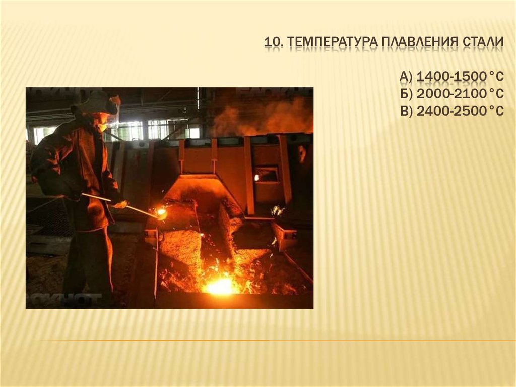 10. ТЕМПЕРАТУРА ПЛАВЛЕНИЯ СТАЛИА) 1400-1500°С