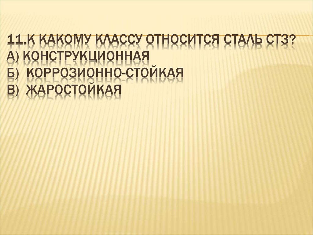 11.К КАКОМУ КЛАССУ ОТНОСИТСЯ СТАЛЬ СТ3?А) КОНСТРУКЦИОННАЯ