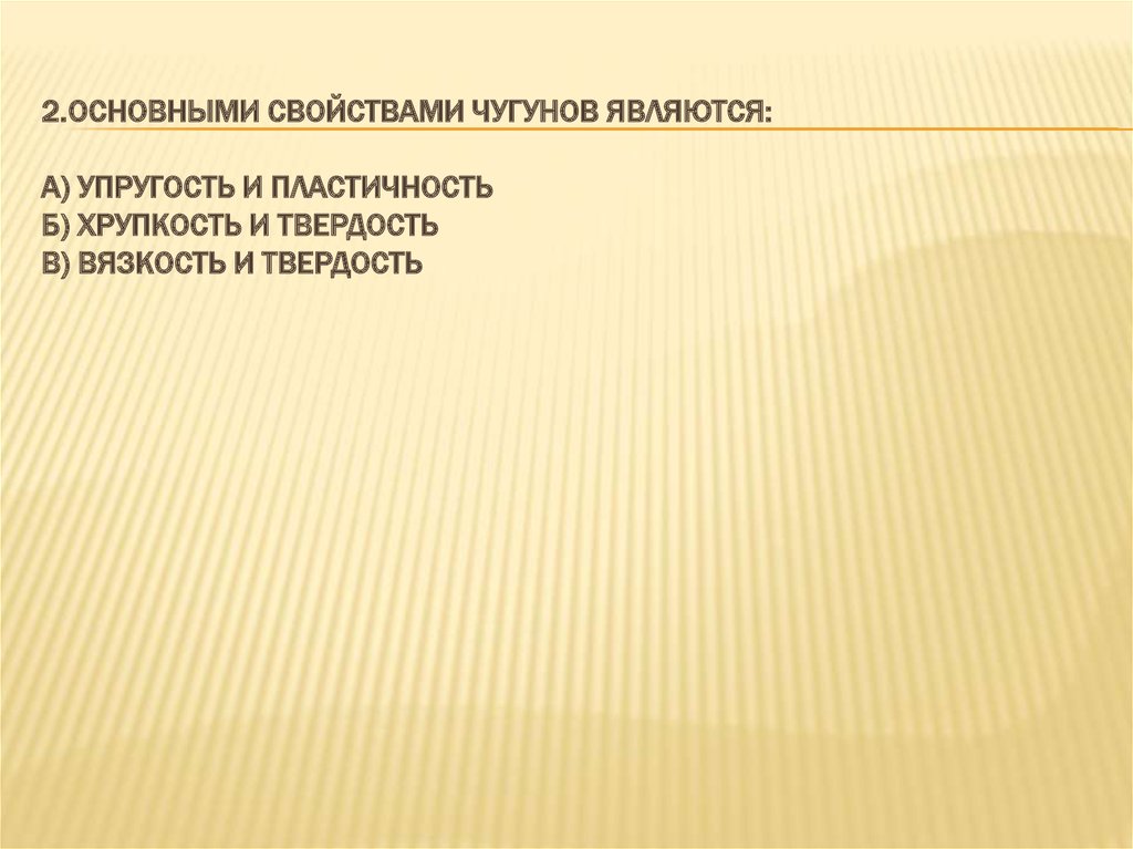 2.ОСНОВНЫМИ СВОЙСТВАМИ ЧУГУНОВ ЯВЛЯЮТСЯ:А) УПРУГОСТЬ И ПЛАСТИЧНОСТЬ