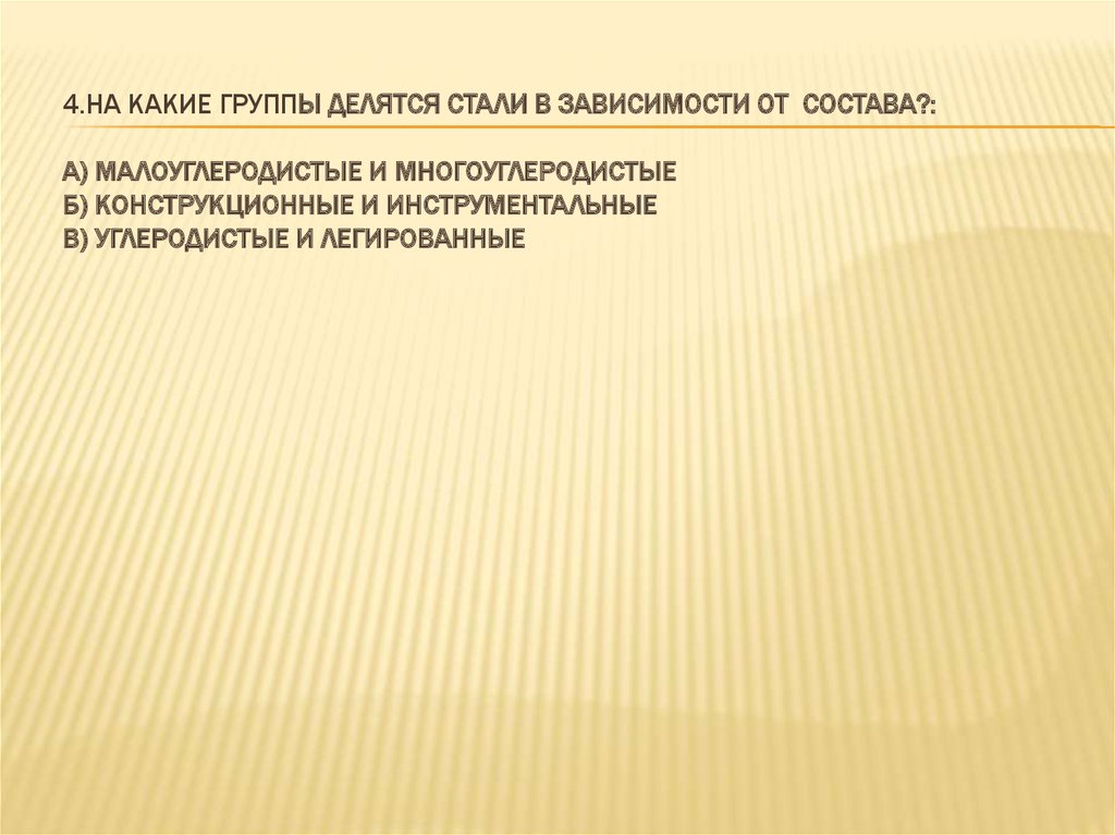 4.НА КАКИЕ ГРУППЫ ДЕЛЯТСЯ СТАЛИ В ЗАВИСИМОСТИ ОТ СОСТАВА?:А) МАЛОУГЛЕРОДИСТЫЕ И МНОГОУГЛЕРОДИСТЫЕ