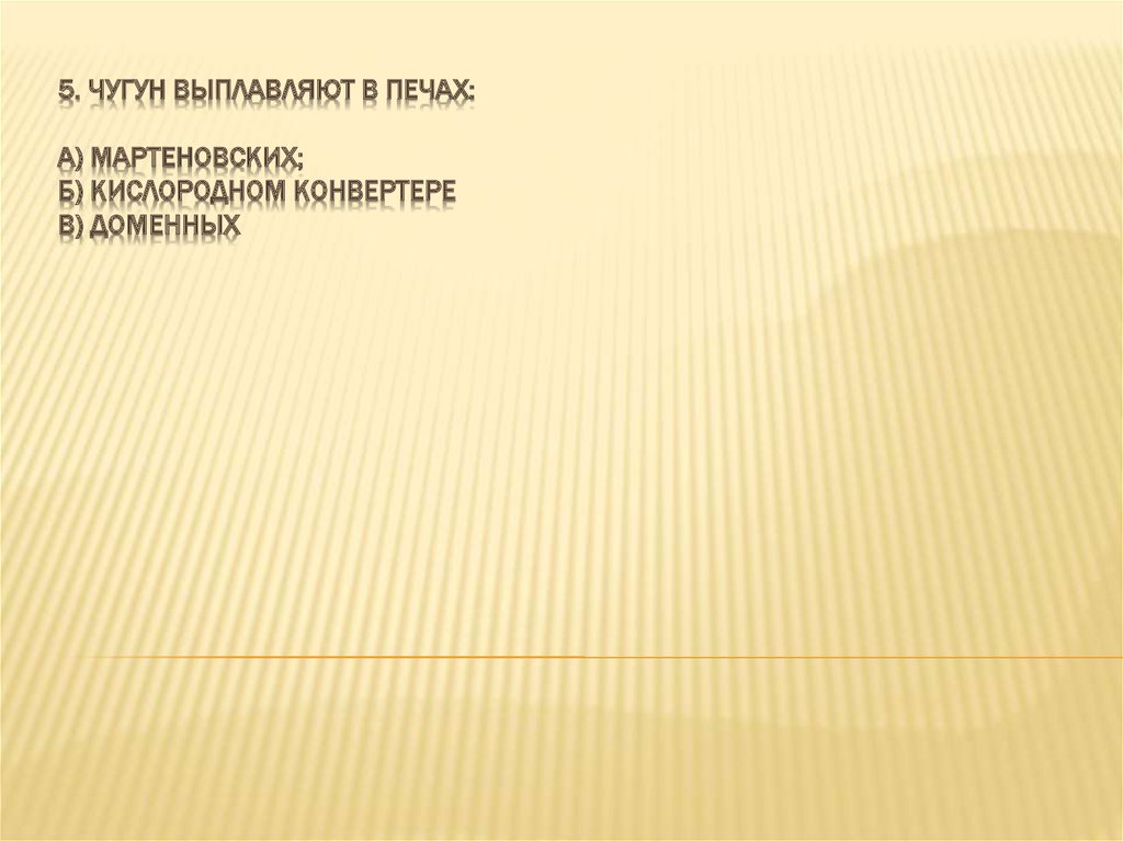 5. ЧУГУН ВЫПЛАВЛЯЮТ В ПЕЧАХ:А) МАРТЕНОВСКИХ;