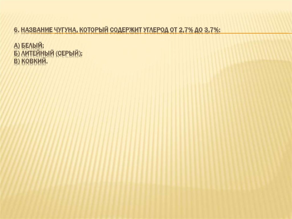 6. НАЗВАНИЕ ЧУГУНА, КОТОРЫЙ СОДЕРЖИТ УГЛЕРОД ОТ 2,7% ДО 3,7%:А) БЕЛЫЙ;