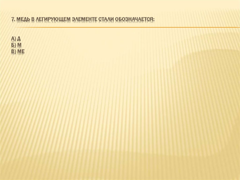 7. МЕДЬ В ЛЕГИРУЮЩЕМ ЭЛЕМЕНТЕ СТАЛИ ОБОЗНАЧАЕТСЯ:А) Д