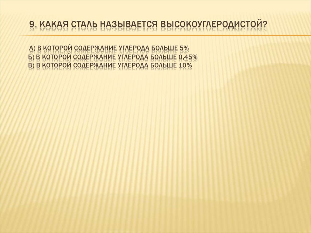 9. КАКАЯ СТАЛЬ НАЗЫВАЕТСЯ ВЫСОКОУГЛЕРОДИСТОЙ?А) В КОТОРОЙ СОДЕРЖАНИЕ УГЛЕРОДА БОЛЬШЕ 5%