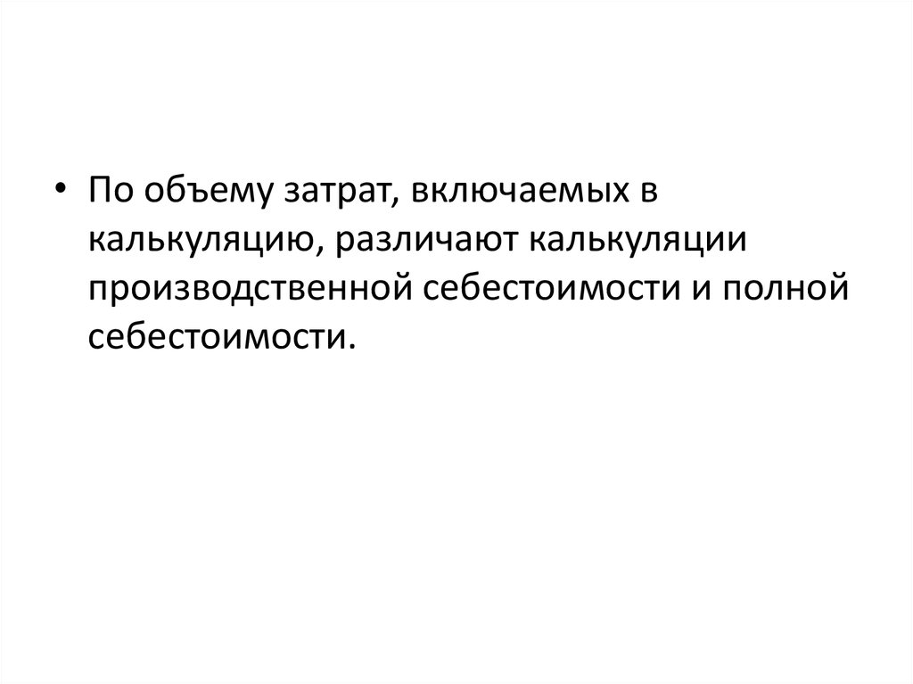 • По объему затрат, включаемых вкалькуляцию, различают калькуляции