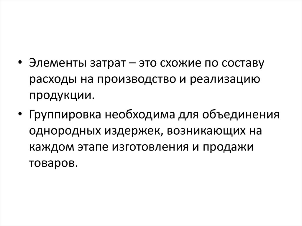 • Элементы затрат – это схожие по составурасходы на производство и реализацию