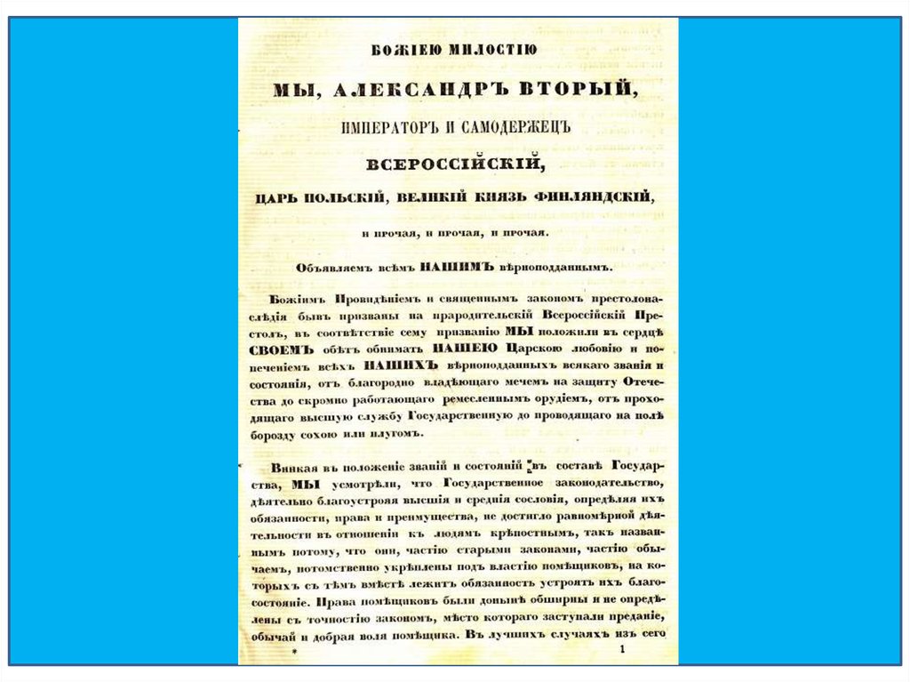 19 ФЕВРАЛЯ 1861 ГОДА - ВВЕДЕНИЕ В ДЕЙСТВИЕ