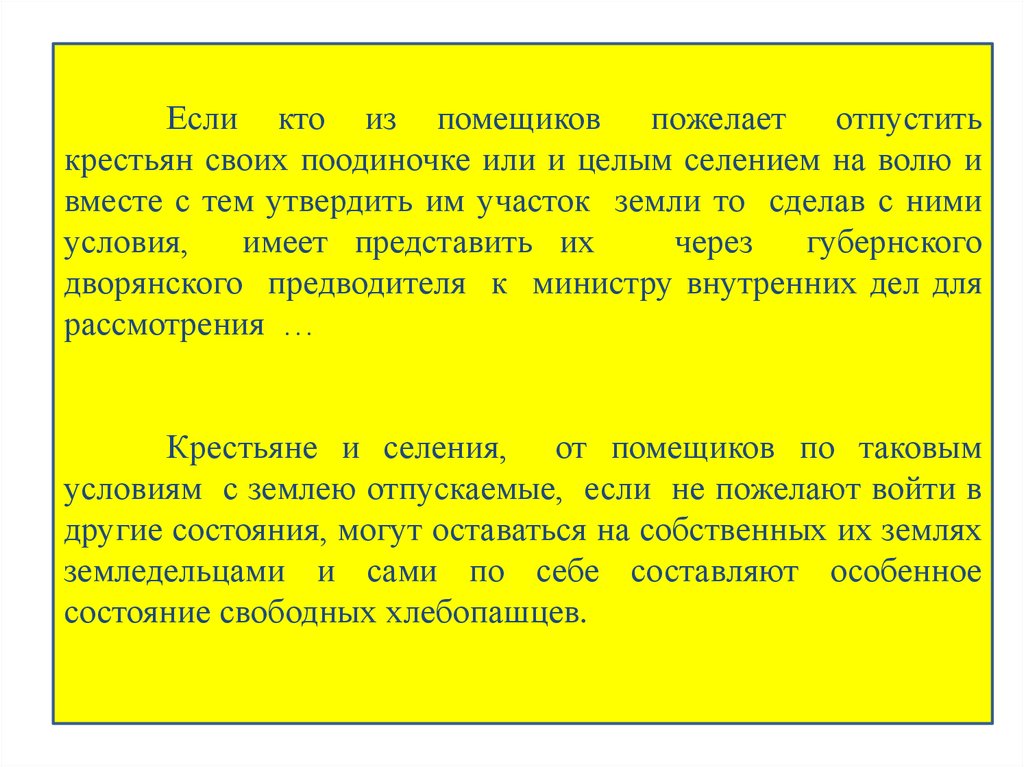 Если кто из помещиков пожелает отпуститькрестьян своих поодиночке или и целым селением на волю и