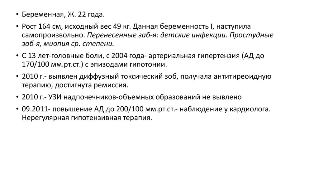 • Беременная, Ж. 22 года.• Рост 164 см, исходный вес 49 кг. Данная беременность I, наступила