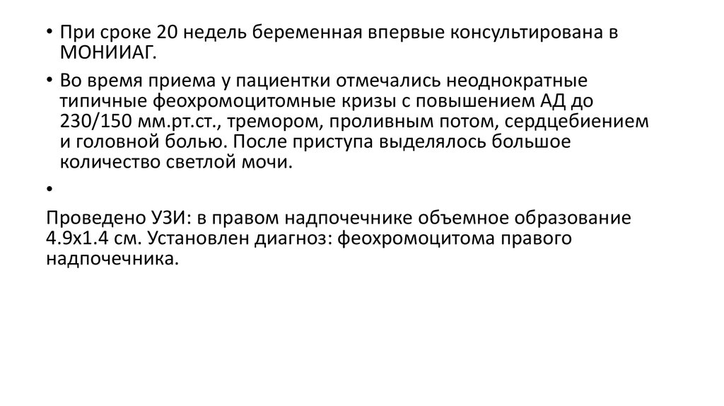 • При сроке 20 недель беременная впервые консультирована вМОНИИАГ.