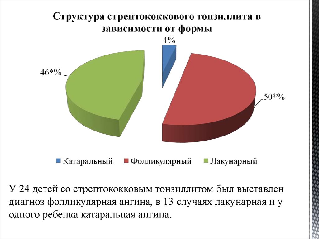 У 24 детей со стрептококковым тонзиллитом был выставлендиагноз фолликулярная ангина, в 13 случаях лакунарная и у